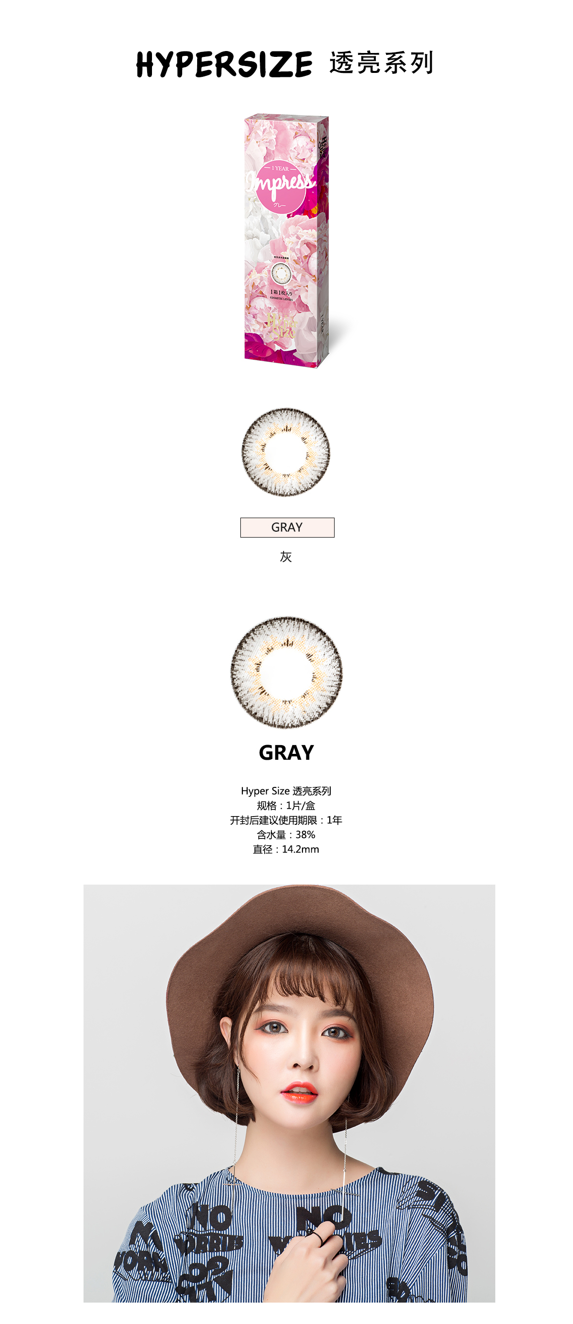中等直径,属于自然放大眼睛的款式。粉色其实可以淡妆也可以混血妆容,并不像其他混血款式那么夸张。日常妆容也可以驾驭,实用性很高的一款。
